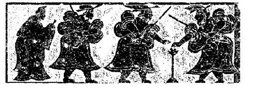 以二桃杀三士为题材的画像石(砖)在河南南阳、山东嘉祥宋山小祠堂、陕西绥德四十里铺均有出土。