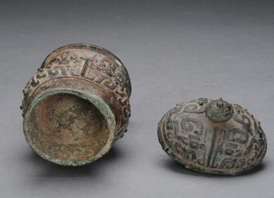 “守父乙”铜觯分盖、身两部分。器盖面隆起,椭圆冠状,上有菌状钮。钮上有四个涡状纹图案。盖面为对称的兽面纹图案。