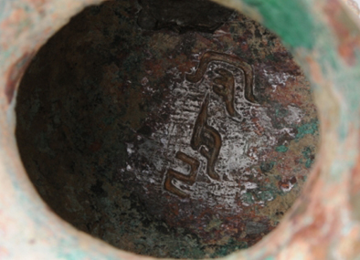 “守父乙”铜觯为范模浇铸制作而成。根据河南省安阳市殷墟苗圃北地发掘的大量铸铜遗物中的陶范和陶模可大致看出觯身的用范块数,即用两块外范、一块腹内范和一块圈足内范,共四块范。浇口设在圈足边沿上,浇铸时口向下[2]