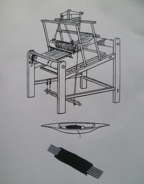 然而,缂丝这项古老的手工技艺,它的织造工具仅是一台简便的平纹木机和几十个装有各色纬线的竹形小梭子和一把竹制的拨子(图12)。织造时,艺人坐在木机前,按预先设计勾绘在经面上的图案,不停地换着梭子来回穿梭织纬,然后用拨子把纬线排紧。织造一幅作品,往往需要换数以万计的梭子,其花时之长,功夫之深,织造之精,可想而知。缂丝无关印染,不需底布,工艺繁复,因此,缂丝作品大多是集体创作,且创作历时较长,完成一件作品通常需要几个月乃至一年以上,后人判断这类作品价值多依据其作品本身的工艺。一件成功的缂丝作品,所用人力物力也非普通人家可以承受,长期以来,缂丝往往被达官贵族所垄断,普通百姓很难有能力购买使用缂丝织物。