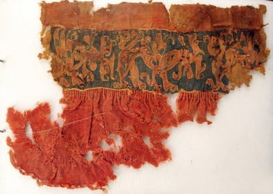 图13 1984年洛浦县普拉1号墓出土的龙纹缂织绦裙,汉,长39厘米,宽38厘米,新疆维吾尔自治区博物馆藏