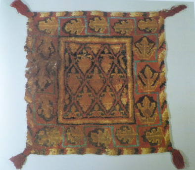 图14 1984年新疆和田地区赛依瓦克汉代墓群1号墓出土的树叶纹缂毛坐垫,长76厘米,宽73厘米,新疆维吾尔自治区文物考古研究所藏