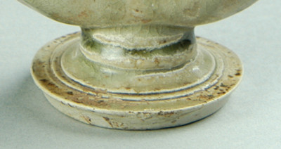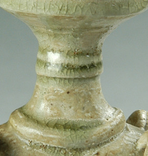 此壶胎骨较为厚重,胎质不甚紧密,通体的釉色的绿中闪黄,釉层较薄,且不均匀[1]。仔细观察壶体的下部,会发现有流釉的现象,以及有玻璃状的垂釉,另外整件器物的釉面有许多细碎的开片纹。细看这件鸡首壶的圈形底部,其露胎无釉,应为“正烧”法烧制,按照《中国文物大辞典》中的解释:正烧又称仰烧,是瓷器烧制法,烧制时坯件口向上放在垫具上,装入匣钵入窑焙烧。仰烧的器物口缘有釉而底足露,是北宋早期覆烧发明之前,除对口烧外,瓷器装烧基本采用这种方法。 [2]
