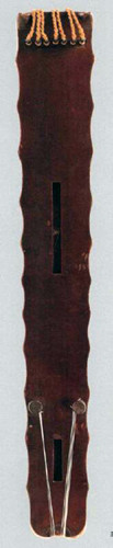 万壑松琴(图12)[12]。明代,山东省博物馆藏。通长123.0厘米、肩宽20.4厘米、尾宽14.7厘米。岳山长与琴边齐,肩在二徽与三徽中间,腰上至八徽偏上、下至十徽,足在九徽;黑色漆。平直琴首、琴首中部有一小凸起,方形琴头、琴头下部稍凸,平底小弧形琴项,浅平底琴腰,其形制与传统的仲尼式古琴(比如故宫博物院藏仲尼式万壑松琴)基本一致,只是在琴首、琴头和琴项处稍有差异,因此可将其琴式定名为仲尼式变体。
