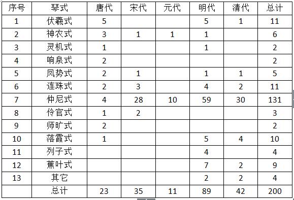 现存的一些明清文献中对古琴的琴式有记载,部分文献中还绘制有琴式图样,比如明代的《太音大全集》《风宣玄品》《琴书大全》《文会堂琴谱》《太古正音琴经》《琴适》《古音正宗》、清代的《琴苑心传全编》《德音堂琴谱》《五知斋琴谱》《兰田馆琴谱》《天闻阁琴谱》等,这些文献中记载的琴式总和超过百种,但现存传世历代古琴实物的琴式远没有文献中记载的多,常见的大概只有十几种(这些琴式的统计数量,均包含其变体),比如:伏羲式、神农式、灵机式、响泉式、凤势式、连珠式、仲尼式、伶官式、师旷式、落霞式、列子式、蕉叶式等。在笔者统计的200张历代古琴实物中,仲尼式最多有131张、比例超过75%,伏羲式、连珠式、落霞式、蕉叶式、神农式、凤势式、列子式也较为常见,其它琴式则较少;不同时代古琴实物的琴式种类,唐代、明代、清代较多,宋代和元代较少;唐代已有的琴式较多,明代也出现有几种新琴式,宋代、元代、清代出现的新琴式较少;仲尼式从宋代起一直都是琴式的主流,伏羲式、神农式、凤势式、连珠式、落霞式等的时代延续性较好;落霞式、蕉叶式等自明代起采用的也较多(详见表1)。