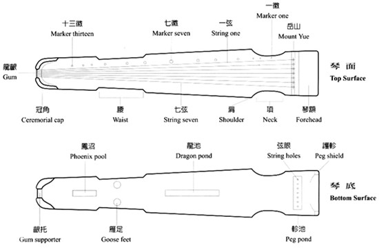 多数古代文献认为:琴面上隆呈圆弧形、琴底平直、首端宽、尾端窄,琴体自琴肩附近至两头逐渐变窄、减薄;琴肩位置多在三徽正,最下为三徽下三分之一处;琴腰位置多在八徽至十二徽偏上,最窄处的宽度多和琴项最窄处的宽度相近;琴尾宽度多和琴项最窄处的宽度相近。