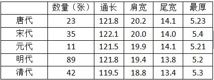 古代文献中对琴体尺寸的记载较多,但相互间差别较大,比较认同的说法是琴长三尺六寸六分、肩宽六寸、尾宽四寸,但由于各时代的尺度不同,参考意义不大。从传世古琴实物的平均值来看:唐代,通长121.8厘米、肩宽20.2厘米、尾宽14.1厘米、最厚5.23厘米;宋代,通长122.1厘米、肩宽20.0厘米、尾宽14.0厘米、最厚5.4厘米;元代,通长121.0厘米、肩宽19.7厘米、尾宽14.1厘米、最厚5.2厘米;明代,通长121.8厘米、肩宽19.4厘米、尾宽13.8厘米、最厚5.2厘米;清代,通长119.5厘米、肩宽18.8厘米、尾宽13.4厘米、最厚5.3厘米。从统计可以看出:唐代和宋代的琴体通长和宽度都较大,宋代以后通长逐渐变短、宽度逐渐变窄,但琴体厚度变化不大,这说明琴体形制在逐渐变短、变窄、变圆(详见表2)。