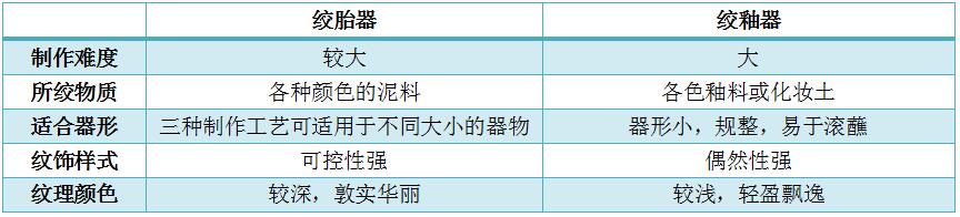 为体现的更为直观,以表格的形式将绞釉器与绞胎器的主要特点进行比较。