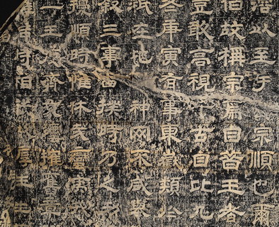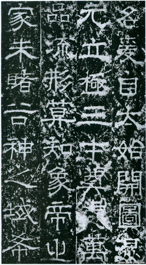 唐玄宗以前的隶书,继承了魏晋南北朝时的似正似隶、古朴方整的遗风。以初唐书法名家欧阳询(557-641)为例,欧阳询的隶书取法魏晋,融险峻之气于笔锋,形成初唐隶书的独特风格。观其隶书代表作《大唐宗圣观记》(图2),字体紧密雄茂、左右分展、奇正平稳、端妍沉实,亦带有东汉蔡邕《熹平石经》的风格(图3)。总体来看,欧阳询隶书既秉承了魏晋质朴之遗绪,受楷书影响强烈,笔力劲拔,又富于神采,代表了过渡时期的唐隶风貌。