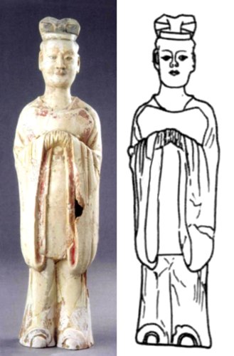 2.裤褶  原为北朝武吏服。褶系上衣,交领、左衽、右衽皆有,但右衽是汉族的习惯,身短而袖长,且为阔袖,腰间束带。裤系下衣,北朝裤口较小,为行军方便,裤腿间还有横襕系缚。初唐时裤口较大,习称大口裤,后逐渐为裙代替。