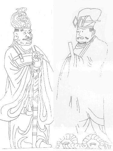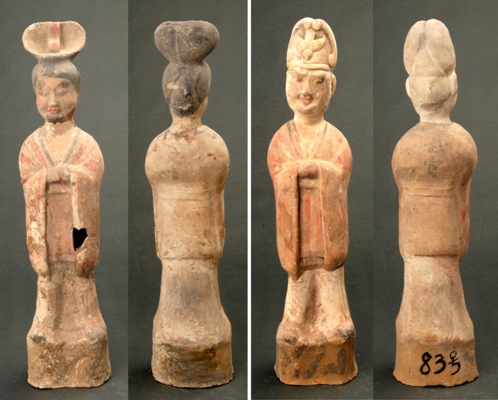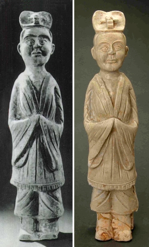 初唐、盛唐之际,河南的唐墓还出土了头戴二梁进贤冠的文官俑。如2005年,郑州市文物考古研究院在汝河路启福花园发掘的公元673年的杨质墓[4]出土一对文官俑,裲裆与褾皆贴金,俑站于低台座上,级别较高,故头戴二梁进贤冠(图3)。