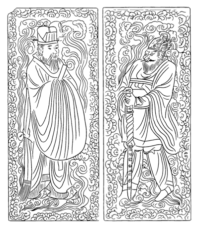 公元720年以后,河南地区的唐墓中的文武官俑急剧减少,三彩文武官俑几乎不见。但在西安地区,文武官俑的发展历程还远未结束,一直使用到公元750才有所减少。此后文武官俑仅在高官或王族墓中使用,且不少是刻在石门上的线刻。如公元745年西安苏思勗墓[9]石门线刻文官俑(图8),公元763年西安高力士墓[10]石门线刻文武官俑(图9 ),公元784年西安唐安公主墓[11]中石门线刻文武官俑(图10),皆博大闳中,气势勃然。