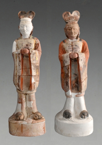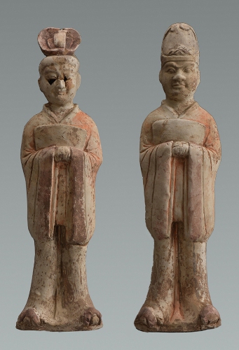 唐代文官俑多左右成对并置于墓室较醒目之处,且高大精美,有不可侵犯之气势。与武士俑和镇墓兽等一起通常随葬在皇亲国戚和官吏墓中,昭示墓主人尊贵的身份与地位,同时也折射出盛唐时期经济与文化的繁荣,以及厚葬之风盛行的社会现实。在制作工艺上分为彩绘俑和釉陶俑两种,并继承了前代的模制和捏塑两种技术。