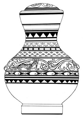 1953年4月,在洛阳烧沟汉墓81号墓发掘出土的绘彩图案纹带盖陶壶(图十),灰陶胎,贮藏器,西汉,口径19.00厘米,腹围103.90厘米,通高48.70 厘米。该器造型完整,图案部分脱彩,直口,长颈微束,鼓腹,平底呈假圈足。体为鼓腹式,盖呈覆钵形状,上端绘有三方连续涡纹。口上承带子口的半球形盖,腹侧有两个朱彩实鼻铺首,为饕餮纹饰。通体施姜黄色,口至中腹用朱、黑、兰彩绘图案带数层,主题纹饰为宽带弦纹、锯齿纹、三角云纹、波状纹、云朵纹等,盖上亦为朱、黑、兰三彩绘卷云纹。该壶特点纹饰组合纵向秩序,横向连续,图案布局富有节奏感。