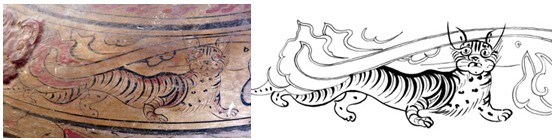 图六 四神纹饰彩绘陶壶上的白虎纹饰局部及摹本