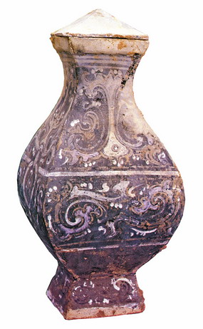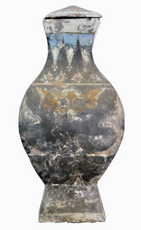 郑州西郊汉墓出土的绘彩云纹带盖陶方壶(图十八),汉代,口径12.50,通高48.50 厘米,轮制。该器方口,束颈,覆斗式方圈足,口上承以带子口的攒尖方盖。该陶壶的铺首工艺区别于其它陶壶的铺首,施黄、白两色进行彩绘铺首部分,纹饰为兽面纹在肩部两侧均匀对称,其余从顶盖至足均施兰、白两色进行彩绘带状条纹、变形云纹等。该陶壶独立的方壶造型和色彩明快的装饰风格,在汉代出土的陶器中较罕见。