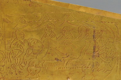 金棺上所饰刻的释迦涅槃故事与《大般涅槃经》所记完全一样,其表情安详,慧眼微闭,似睡非睡,怡然自若,毫无苦处,显得慈悲宽怀,气度非凡。弟子群集于卧榻四周。 涅槃图像是佛教艺术中一种古老而又常见的题材。
