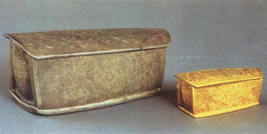 金棺银椁,北宋,其中金棺,金质,长19厘米,宽11厘米,高14.5厘米,重614.52克;银椁,银质,含银量99%,长43厘米,宽20厘米,高34厘米,重2384克。1988年7月河南省邓县福胜寺塔地宫出土。