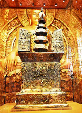 南京长干寺遗址,始建于北宋大中祥符年间的长干寺真身塔地宫出土的七宝阿育王塔,塔高1.1米,堪称“金塔之最”,考古人员在南京古长干寺阿育王塔内发现两套银椁,一套为长方形,存放于塔内上部的一个角上;另一套为方形,发现于塔身下部。这种复合式的瘗藏储具还是第一次发现。正方形银函被首先打开,银函里,是一只稍小的正方形银函。小型银函里有一只琉璃瓶、一尊铜佛像和一个透明的佛珠。显微摄影所见琉璃瓶内所装的舍利呈现黄色、乳白色、黑色等。雕有须弥座、四个侧面雕着12尊佛像的长方形鎏金银椁。在掀开带有子母扣和云母锁的撑盖后,一个长约6厘米、宽约3厘米,绕着金绳的金棺出现。金棺内,有一块呈蜂窝状的黄褐色顶骨,还有三只装有舍利的琉璃瓶与一只小香盒。