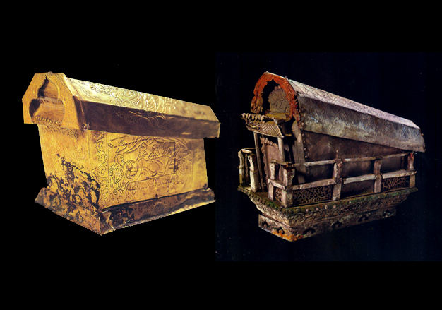 1994年3月,山东省汶上县宝相寺太子灵踪塔地宫发现宋代瘗藏佛牙舍利的金椁银棺,系北宋皇室精品之作。整器由金椁、银棺、银须弥座组成。金椁为银质贴金箔,长26厘米,高28厘米,宽8.4厘米。椁盖为五棱体,套两道金箍,前档有錾宝相花火云冠。金椁安置在银须弥座上,须弥座围透雕栏杆,通体錾吉祥缠枝纹,束腰有镂空如意云斗图案。座头两侧悬“太平通宝”鎏金币二枚,是宋太宗时期皇家特制的供养钱。金椁整器集锤鍱、贴焊、铆合、镂雕、錾刻、贴金等繁缛手法于一体,玲珑剔透,精美绝伦,具有极高的工艺考古价值。银棺长16厘米,高4厘米,宽5-6厘米,由盖、体组成,素面,银封箍一道,分前后两室,以木匣分隔,前盛佛牙,后储舍利,有丝织物包裹。