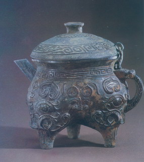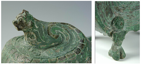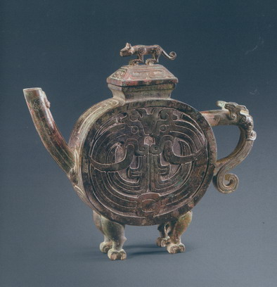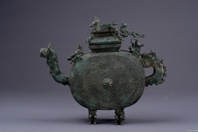 2、这种扁圆鼓形盉造型别致,构思奇特,巧妙地将龙、虎、凤、鸟、人、兽等造型与器盖、鋬、流、足、腹部相结合,增加了趣味性,既有实用功能,还有强烈的装饰作用,体现出周代精湛的青铜工艺水平。