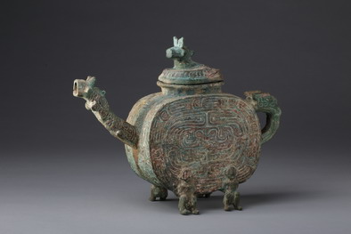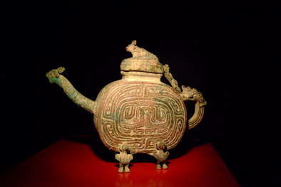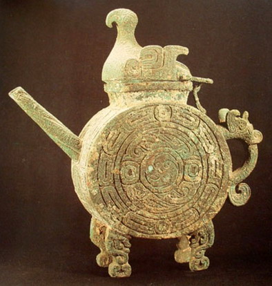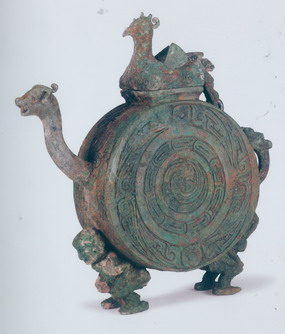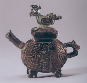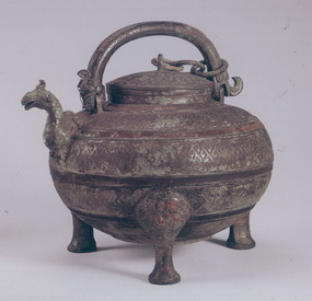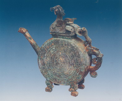 1991年,三门峡虢国墓地M2009出土的凤鸟纹人形足铜盉,西周晚期器。高24.3厘米,长31.4厘米。有盖,盖面中部向上隆起,顶部有一盘龙形握手,盘龙昂首前视,盘旋而卧,身饰鳞纹,胸前双爪着地。盖边缘附一环形钮(已残),子口。器口为椭长方形母口,厚圆唇,短束颈,腹腔呈侧置的扁圆鼓形,前有四足伏地龙形流,龙身与腿部饰垂鳞纹,曲而上扬,流口有裂缝,后有作龙首吐舌下弯呈半环形的器鋬,鋬上端有环形钮,与盖钮之间原应有链条连系。腹下附人形四足。腔体正、背面中部各饰一对凤鸟纹,其外围饰S形斜角云纹,最外围饰一周有珠重环纹,两侧饰两行有珠重环纹。
