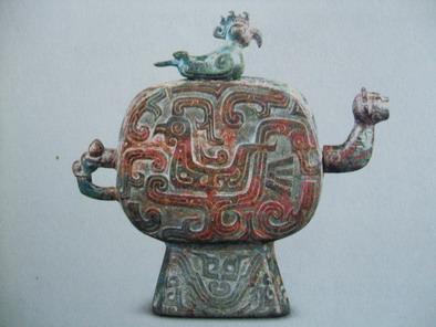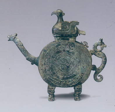 1963年,陕西省扶风齐家村铜器西周窖藏出土的它盉[8],西周晚期器。通长40.2、通高37.5厘米,盖内铸有一个字“它”。现藏陕西历史博物馆。龙形流管细长,龙角曲折,张口瞠目,四足屈曲紧贴流壁。鋬为回顾式立体龙纹,曲角吐舌,尾巴上卷。器盖作圆雕卧鸟形,钩啄,张翼,短尾,尾部系有活链和肩部的系相套铸。四兽形足,上饰夔龙纹。腹呈扁圆鼓形,腹侧饰重环纹,鼓面中部饰涡纹,周以重环纹和斜角云纹各一圈。