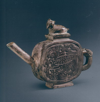 1998年,甘肃礼县圆顶山M2出土的蟠虺纹铜盉[15],春秋中晚期器。通高32、最大腹径21厘米,覆斗形盖,盖上有方形圈足式捉手,深子口;身方口,方唇,扁圆腹,底微圜,下接四个屈肢蹲坐、头顶方角、圆目的兽形支足。盖顶中部饰一蹲踞的大鸟。捉手四角各一只蹲踞的小鸟,鸟高冠,圆目,长喙,身上饰羽纹及窃曲纹,可转动。盖斜面四角各附一只仰首虎,虎方耳,突目,屈肢,卷尾。盖后侧一行虎,为回首,长尾后上卷,身上饰虎纹。身前部有兽首形流,兽首方角,怒目,大口,口角一对獠牙上翘。流上部有一回首兽形。身后部为带扉棱兽首形鋬。肩部四角附四只上行虎,均向外侧首。鋬上部为一蹲座的公熊,熊前爪与器盖后侧回首虎的后爪构成了可开启盖的轴。盖顶、盖面饰蟠虺纹,身饰蟠虺纹和宽带纹。正中部前后均为一对称突起的圆形兽首形饰。