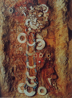 虢季墓(M2001)位于国君兆域区的西部,为一座大型竖穴土坑墓(图21),南北长5.3米,东西宽3.55米,距现地表深11.5米。 墓穴四壁从上到下以淡绿色涂料粉饰,葬具为三重,即单椁重棺,在重棺外又用以彩绘木框结构的棺罩。葬式为仰身直肢葬。随葬器物十分丰富,达5293件,依质地可分为铜、金、铁、玉、石、玛瑙、陶、骨、皮革、竹、木、麻、丝帛等19类,其中以铜器和玉器为大宗。铜器品类齐全,数量众多,其中40件有铭铜器均言明虢季自作用器(图22)。玉器材质优良,雕琢精美,多为古玉中之精品(图23)。另外,在该墓东侧附葬有大型车马坑,长47.6米,宽37—41.6米,葬有车16辆马70余匹,狗6只。丰富多彩的随葬品及陪葬的大型车马坑充分显示出墓主身为国君的显赫地位与威严。