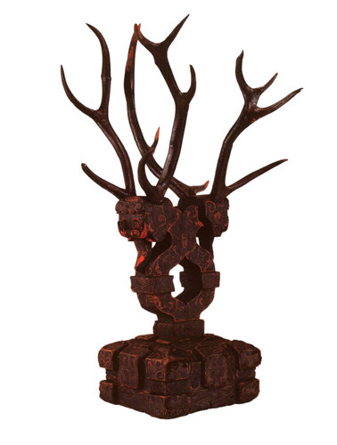 战国中晚期,镇墓兽造型多出现鹿角,战国早期的这类镇墓兽是没有鹿角的,中晚期才出现鹿角,一般认为鹿角象征防御,以免墓主人受鬼邪侵扰。以河南信阳楚墓1号墓出土的漆彩绘镇墓兽为例[6](图5)。头顶插有两个鹿角,角上髹成组的黑色卷云纹,两耳翘起,头部似兽。双目圆大,张口吐舌,舌垂直值腹部。胸部绘有双乳,背部雕刻有四组对称的卷云纹。全身除眼、舌髹有红漆,耳、爪髹有黄漆外,其余各部皆髹褐色漆并绘有红黄相间的鳞纹。通高128厘米。