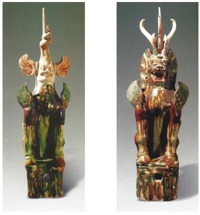 鼎盛期。隋唐时期,结束战乱,平息割据,国家空前强大、统一,政治稳定,经济繁荣昌盛,墓中随葬镇墓兽达到一个高峰鼎盛期。特别是盛唐厚葬之风盛行,上层人物的墓葬中出现大量躯体高大、制作精美、装饰华丽、釉彩鲜艳、形象狰狞恐怖的三彩镇墓兽。以河南偃师城关镇北窑村出土的两件三彩镇墓兽为例[10], M5:32出土三彩人面兽身镇墓兽(图9),人面兽身,阔口,高鼻,怒目,突眉。头顶生螺旋角,额上有一绳索状小角,脑后生冲天戟,一双大耳左右对称,两肩生飞翼,足成牛蹄状,前肢直立,踞坐于梯形高台上。通体饰橙、绿、白三彩,制作精美,为三彩中之佳品。通高77厘米。M5:31出土的三彩兽面兽身镇墓兽(图10),狮面,张口露齿,大眼圆睁,獠牙外露,颚下生须。头顶生叉形双角,脑后生冲天戟,头后加饰火焰纹,颈部两侧鬃毛伸展,肩生双翼。足呈牛蹄状,前肢直立,踞坐于梯形高台座上。釉色与人面兽身镇墓兽大致相同,整体施黄、绿、褐釉,同为三彩中之佳品。通高76厘米。