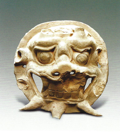 衰落期。晚唐至五代,这一阶段镇墓兽已出现衰落之势,镇墓兽已很少出现,代之而起的有一种狰狞可怖的圆形陶制面具,古人称“魌头”。例如河南巩义市文物保护管理所藏的陶绘彩魌头[11](图11)。虎面,高额突眉,瞠目,宽鼻,阔口露齿,头顶双角已残失,两耳残,胲下有5个角状胡须,其中三个残。耳部下方各有一钻孔,灰白胎,胎质坚硬,有绘黑、红彩痕。直径23.5厘米,厚10厘米。