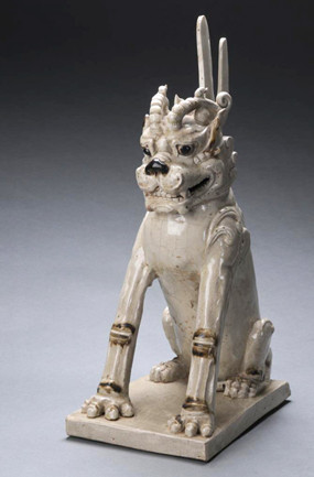 1959年中国社会科学院考古研究所安阳发掘队在安阳市北郊豫北纱厂张盛墓发掘时,出土一对白釉镇墓兽。墓主张盛,字永兴,南阳白水(今河南省南阳县)人。生于北魏景明三年(公元502年),卒于隋开皇十四年(公元595年),享年54岁。张盛出身名门望族,家中世代为官。隋朝建国后,他从县令一类的下级官吏,递升至征虏将军、中散大夫,遂成为统治阶级的中上层人物。