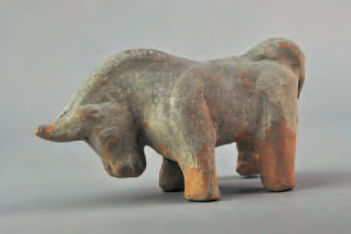 发展期。魏晋、南北朝时期,战乱频繁、社会动荡、分裂割据,是中国古代民族大融合时期,在这样的大背景下,墓中随葬镇墓兽的数量较之前明显增多,开始有流行趋势。如河南偃师杏园晋墓所出标本M 34 :64陶质镇墓兽[9](图8),头似牛,神态凶猛,颈上三处鬃毛前剌,四腿粗壮,蹄足,前腿八字形分开,后腿用力猛蹬,如拼命之斗兽。肩胛及脊背处刻印出卷曲鬃毛,尾巴向上卷曲。长34.5厘米,通高23.7厘米。这一时期的镇墓兽在形制上较前期有明显的变化,头部向狮面演化,头生短角或头顶后部伸出一支朝天戟。大体上仍着重表现其动态,缺乏细部雕饰,显得拙稚、古朴,躯体低矮,四肢粗壮有力。但从造型上看,魏晋南北朝时期的镇墓兽并没有完全形成自身特有的艺术风格和时代特征,明显表现出接受了东汉时期造型奇特的独角镇墓兽的影响。