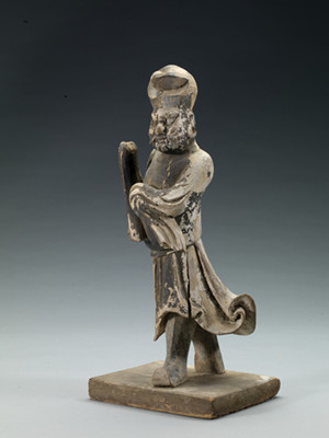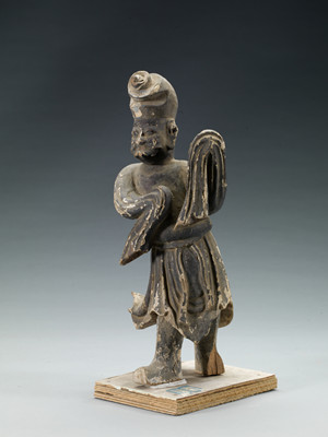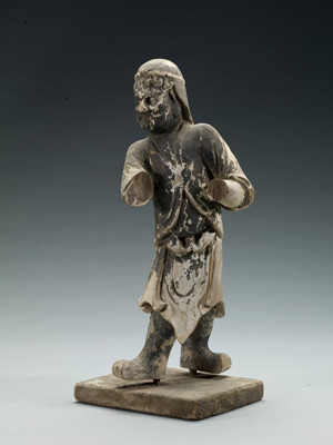 木俑(图4),和3号木俑动作基本相同,五官不如3号木俑立体,但可见大眼,鼻两侧卷曲上翘胡子。在服饰方面4号木俑和3号木俑存在细微差别。区别一,此木俑头戴逆时针旋转螺旋帽;区别二,长袍领子不同,此木俑脖颈正前方可见椭圆状起伏领褶。4号木俑通体可见清晰的黑色图彩,在螺旋帽凸起纹路、袖褶凸起纹路、鼻脊、长袍裙褶凸起处、靴子正前部,存在少许黑彩脱落的情况。木俑左脚前脚掌缺失,脚下木板为后来增补上去的。