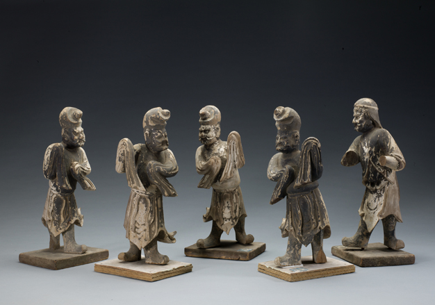 唐胡人舞蹈木俑,唐代,木质,5件木俑高约30厘米,木俑脚下均有长约14.5厘米、宽约11.6厘米的踏板。现藏焦作市博物馆。