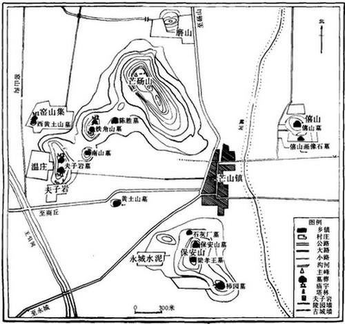 位于河南永城县东北30余公里处的芒山,面积20余平方公里,是芒砀山、保安山、僖山、黄土山、铁角山、夫子山等山的总称。古时亦称砀山,秦时设砀郡、砀县,秦末汉高祖刘邦曾避乱于此,西汉时为梁国辖地, 梁孝王家族的王室陵墓亦分布在芒山的各个山头之上。僖山墓位于芒砀山东的僖山东端峰巅。[1](图1)