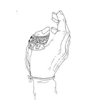 玉韘形佩,考古发掘报告中通常称为“心形佩”,是两汉时期颇具特色的一种单玉佩,由实用器“韘”发展演变而来。文献中对“韘”的最早记载来自《诗经·卫风·芄兰》:“芄兰之叶,童子佩韘;虽则佩韘,能不我甲;容兮遂兮,垂带悸兮。”《说文解字·韦部》曰:“韘,射決也,所以钩弦。以象骨韦系着右巨指。”韘是古代射箭之人戴在右手大拇指上,用韦固定,作拉弦开弓之用,以防手指被弓弦勒伤。(图2)