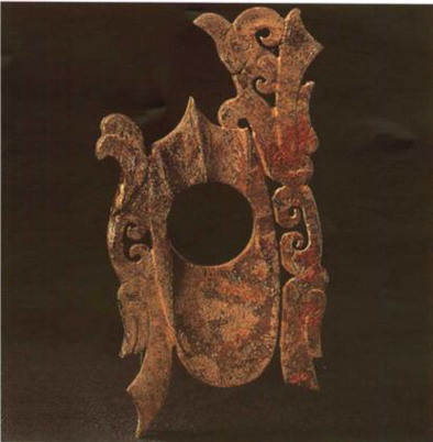 到西汉时期,韘发展到后期阶段,逐渐减少。分化成为配饰的韘经过演变,器身基本成扁平椭圆形,中孔渐小,器身一侧或两侧出现附饰,且附饰渐趋繁缛,器表纹饰考究华丽,成为韘形佩。西汉早中期,韘形佩与韘并存,西汉中期以后,韘消失,韘形佩完全取代了韘,成为装饰器。
