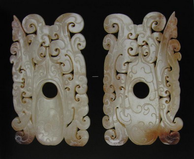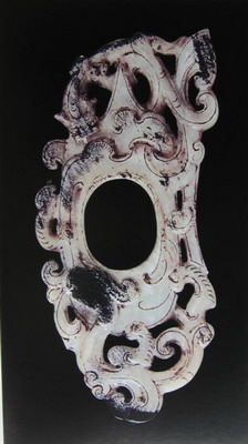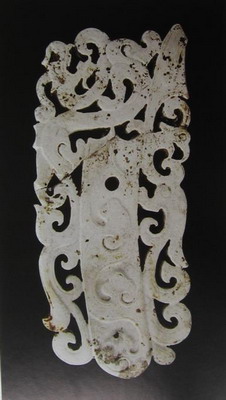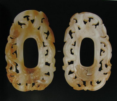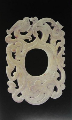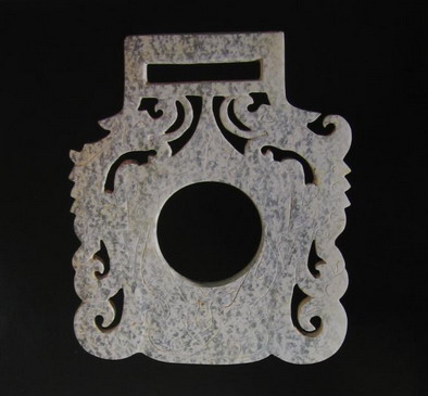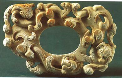 东晋玉韘形佩(图31),长7.1厘米、宽4.6厘米、厚0.47厘米,江苏省南京市中央门外郭家山东晋墓出土。玉青色,经浸蚀而呈灰白色。体扁。正面对角镂雕双螭,一大一小,遥遥相望,中央有一椭圆形穿孔。背面平雕螭身等纹饰。精美别致,玲珑剔透,为魏晋时期玉器中的珍品。[34]