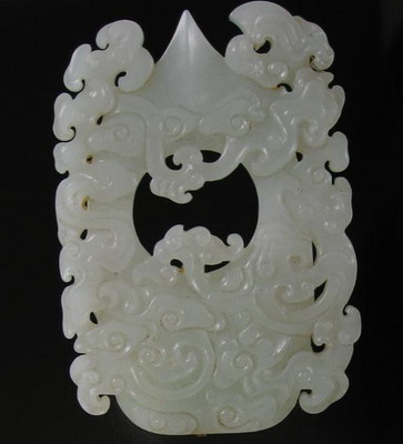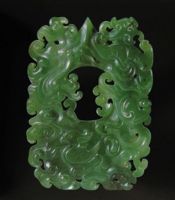 清代玉韘形佩(图33),长7.7厘米、宽4.6厘米,北京市海淀区北京师范大学工地黑舍里氏墓出土。碧玉质,莹绿略透光,局部泛黄色或黑色瑕点。扁片形,以减地阳起镂空技法琢制。四角呈委角。佩一面雕螭纹及鸳鸯戏水;另一面为凤鸟,依附在祥云之中。琢刻线条细密流畅,出土后仍极光亮。[36]