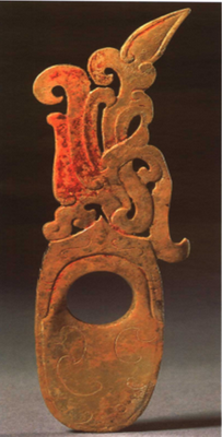 玉觽在商周时代已经出现。商代的玉觽出土物较为罕见,国家博物馆收藏一件一端尖细一端宽阔平齐的弯角形片状玉觽。体中部由一宽凹槽将玉觽分作两部分:上部分浅浮雕龙首纹,龙首大耳、方口、“臣”字形大眼,顶部透钻一圆穿;下部近凹槽端阴刻一周水波纹,水波纹下一周三角状纹,末端素面呈尖细三角形状。西周时期的玉觽出土物也不多见,仅见的几例分布于江苏、陕西、山西等地。春秋时期的玉觽纹饰更加细密繁缛、构图中蟠螭纹十分流行。