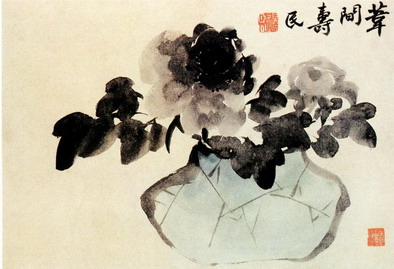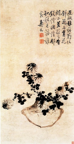 南京博物院收藏的《歪瓶依菊图》(图五),立轴,纸本,纵95.8厘米、横50.4厘米。此幅画系情趣盎然的书画小品,笔意潇洒随意而行,浓墨点叶,淡墨勾花,秀雅高洁,让人爱不释手。作者自题诗曰:“歪瓶雅称菊枝斜,花与真花并不差。持去卖钱偿酒债,那知秋色落谁家。”这首诗反映了作者心灵深处的忧伤。