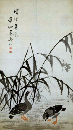 北京故宫博物院收藏的《芦雁图》(图六),立轴,纸本,纵128.7厘米、横49.1厘米。画中两雁在寒沙折芦之间,一雁已息落,一雁盘旋将下,相望相依,宛如一对伴侣;一支芦花,墨色枯淡;雁颈弯曲,一笔而成,由浓而淡。这种大写意的芦雁图,是边寿民独特的创造。有评论家说,这时作者正当中年,其画艺达到炉火纯青,是重要的传世之作。