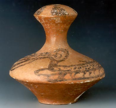 从中国绘画艺术起源的角度来看,一般彩陶上的绘画以装饰纹样为主,而以鹳鱼石斧图为代表的彩陶画则以描绘物象为主,标志着中国史前绘画艺术由纹饰绘画向物象绘画的发展。纹饰绘画与器物密切结合,而物象绘画与器物形状基本脱节,绘画的独立性增强了。在鹳鱼石斧图作品中,鹳、鱼、石斧的描绘极具绘画性。无论是形象的塑造,还是画面的构思,都不像纹饰绘画那样考虑如何与器形有机结合,而它仅仅是以陶缸腹部表面作画而已。在这里,绘画性彩陶与几何纹彩陶的分离,以至绘画与陶器的分离,正是历史发展的必然结果,是人们审美观念、创作思想及绘画技巧向更高阶段演进的体现。