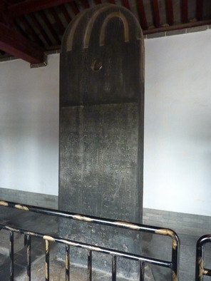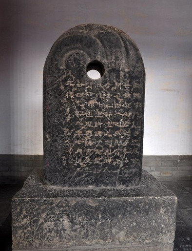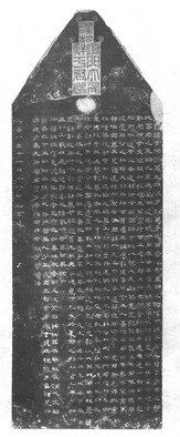 圜首碑。即碑身及断面作长方形,碑首呈圆形,是汉代早期碑的一种形式,有专家认为上圆下方的碑象征着天体。关于上圆下方的涵义,《说文》:“圆,圜全也。”圜,天体也。”在其他人为的事物中也多有类似的“天圆地方”的涵义。如建筑中的“明堂”的形式,《孝经•援神契》:“明堂者,天予布政之宫,上员(圆)下方。”《新论》:“王者造明堂,上员(圆)下方,以象天地。”班固《两都赋》:“其宫室也,体象乎天地,经纬乎阴阳,据坤灵之正位,放太紫之圆方。”李贤注:“圆象天,方象地。”车的形制中也包含有“天圆地方”的涵义,李尤《小车铭》:“圆盖象天,方舆则地。轮法阴阳,动不相离。”《新书•容经》:“古之为路舆也,盖圜以象天,二十八撩以象列星,轸方以象地,三十辐以象月。故仰则观天文,俯则察地理。”在很多文献中也都有对“天圆地方”的解释,如《白虎通德论》之《礼乐》、《辟雍》、《文质》、《天地》等篇。“这说明,碑石的形制,不仅有人们所构思的古老宇宙模式,其中又有神学的影响。”[17]