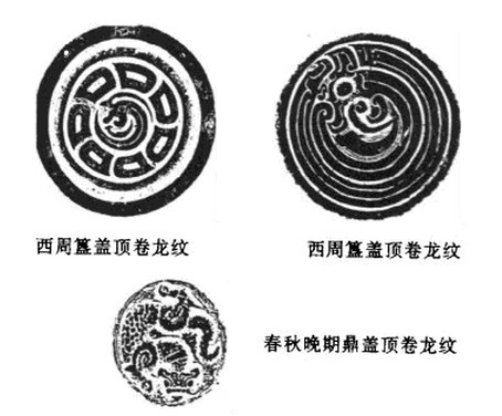 卷龙纹(图二十):龙的躯体作蜷曲状,其中一种是龙头的正面形象居中,躯体盘绕其外,形成一圆形,多饰于盘的中心,见于商末周初;还有一种是龙的侧面形象盘卷成圆形,多见于西周至春秋时期的簋、壶等器盖上。