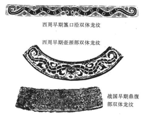 双头龙纹:是一条龙体的两端各有一个龙头,多作斜角线构图,一个龙头在上,一个龙头在下,常见于西周及春秋早期。
