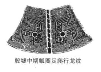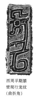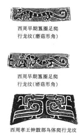 爬行龙纹(图十八):多作龙的侧面形象,前有龙头,张口向下,吻部较长,上唇向上卷曲,下唇向下或上卷。龙头后有一蜿蜒似蛇身的躯体,作爬行状,有一足、二足或无足几种,尾部向上卷曲。盛行于商代早期至西周早期。