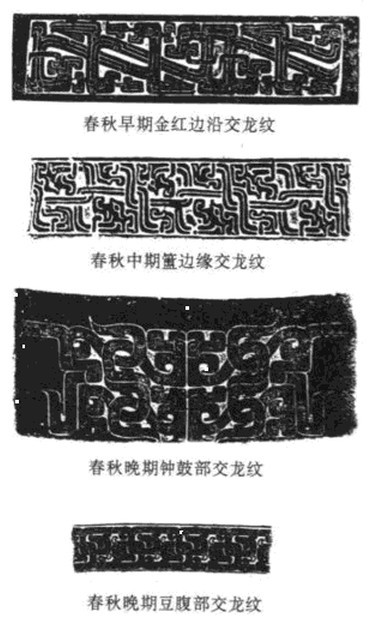 交龙纹(图二十一):即两条以上的龙体相互交缠盘绕,构图较为复杂,旧称蟠螭纹,其形体较小者又称蟠蛇纹、蟠虺纹,盛行于春秋战国时期[26]